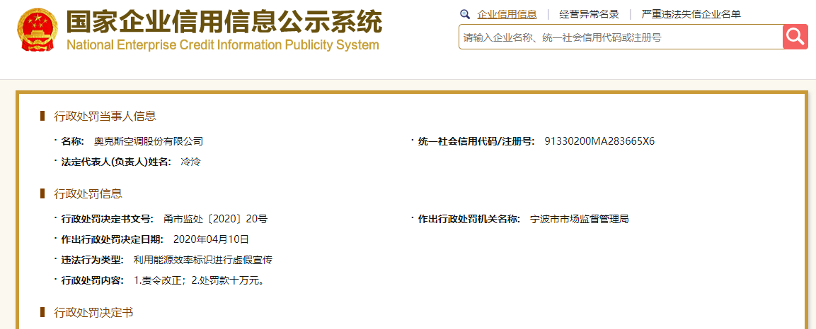 ●据国度企业信用消息系统,4月10日,宁波市市场监视办理局经随机抽样查询拜访发觉,部门空调检测成果取其能源效率标识上的消息不符,对奥克斯空调股份无限公司做出行政惩罚决定:1。责令更正;2。惩罚款十万元。